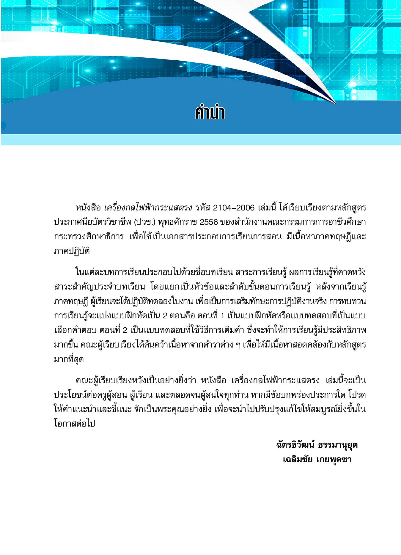"เครื่องกลไฟฟ้ากระแสตรง รหัสวิชา 2104-2006" เล่มนี้ ได้เขียนขึ้นตามหลักสุตรประกาศณียบัตรวิชาชีพ (ปวช.) พุทธศักราช 2556 ของสำนักงานคณะกรรมการการอาชีวศึกษา กระทรวงศึกษาธิการ เพื่อใช้ในการเรียน ประกอบด้วยชื่อบทเรียน สาระการเรียนรู้ ผลการเรียนรู้ที่คาดหวัง สาระสำคัญประจำบทเรียน โดยแยกเป็นหัวข้อและลำดับขั้นตอนการเรียนรู้ หลังจากเรียนรู้ภาคทฤษฎี ผู้เรียนจะได้ปฏิบัติทดลองในงาน เพื่อเป็นการเสริมทักษะการปฏิบัติงานจริง การทบทวนการเรียนรู้จะแบ่งแบบฝึกหัดเป็น 2 ตอนคือ ตอนที่ 1 เป็นแบบฝึกหัดหรือแบบทดสอบที่เป็นแบบเลือกคำตอบ ตอนที่ 2 เป็นแบบสอบทดสอบที่ใช้วิธีการเติมคำ ซึ่งจะทำให้การเรียนรู้มีประสิทธิภาพมากขึ้น ทั้งนี้คณะผู้เขียนได้ค้นคว้าเนื้อหาจากตำราต่างๆ เพื่อให้มีเนื้อหาสอดคล้องกับหลักสูตรมากที่สุด