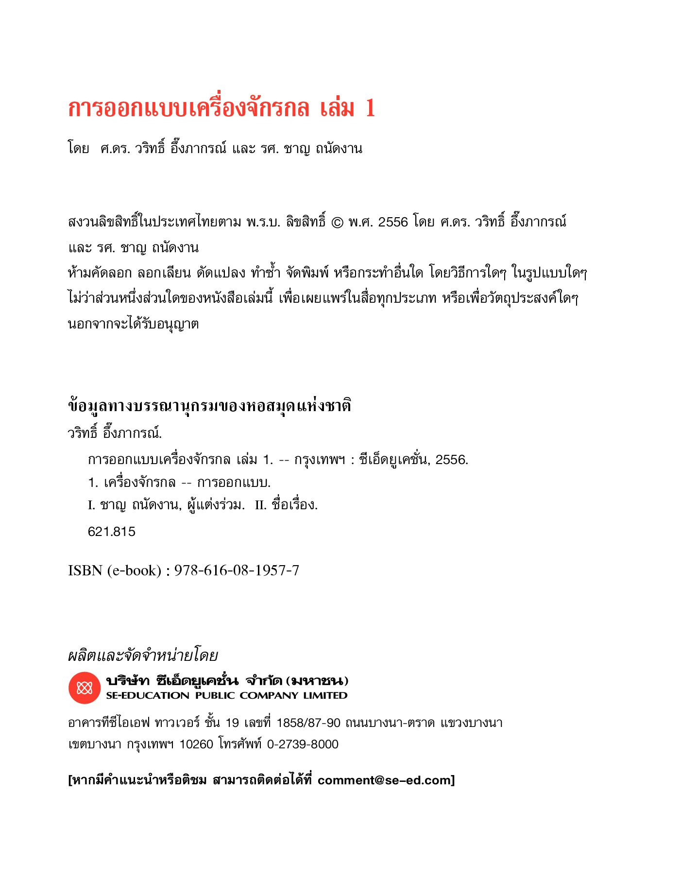 "การออกแบบเครื่องจักรกล เล่ม 1" เหมาะสำหรับผู้ที่เริ่มทำการศึกษาเกี่ยวกับการออกแบบชิ้นส่วนเครื่องจักรกลต่างๆ ซึ่งผู้อ่านจะต้องมีพื้นความรู้เบื้องต้นทางด้านกลศาสตร์ทั่วไป กลศาสตรวัสดุ กลศาสตตร์เครื่องจักร และคณิตศาสตร์ในระดับปีที่ 2 ของการศึกษาทางด้านวิศวกรรมศาสตร์ เนื้อหาภายในกล่าวเริ่มตั้งแต่ปรัชญา การออกแบบในแง่มุมต่างๆ เพื่อให้ทราบถึงขึ้นตอนการออกแบบ เพื่อให้ได้ชิ้นงานที่ทำงานได้ตามความประสงค์ในราคาที่ประหยัดมากที่สุด หลักกการคำนวณออกแบบชิ้นส่วนเครื่องจักรกลอย่างง่าย การวางรากฐานทางทฤษฏีการคำนวณหาขนาดของชิ้นงานแต่ละชนิด นอกจากนี้ยังได้แสดงตัวอย่างการคำนวณ และวิธีอย่างชัดเจน รวมทั้งให้คำตอบสำหรับแบบฝึกหัดท้ายบทอีกด้วย!