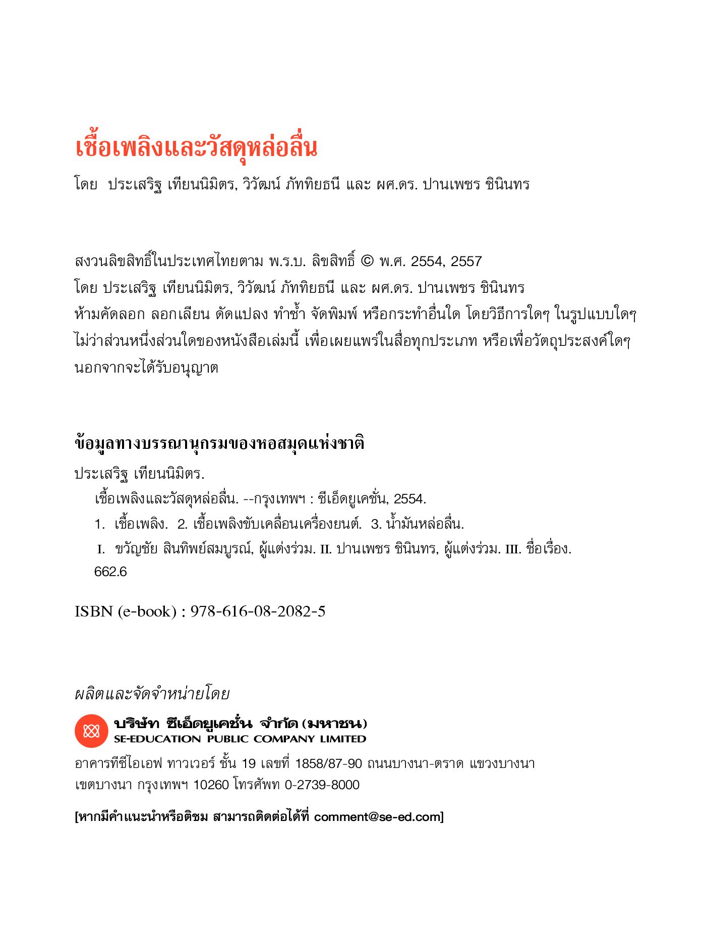 "เชื้อเพลิงและวัสดุหล่อลื่น" เล่มนี้ ได้รวบรวมและอธิบายถึงคุณสมบัติของเชื้อเพลิงนำมันหล่อลื่น และสารหล่อลื่นชนิดต่างๆ ที่เหมาะสมกับงานแต่ละประเภท รวมทั้งกล่าวถึงความสำคัญของสารเพิ่มคุณภาพต่างๆ พร้อมทั้งเหตุผลที่ใช้ เพื่อที่จะได้นำไปประกอบการตัดสินใจต่อการพิจารณาเลือกใช้ได้อย่างถูกต้อง ทั้งยังได้รวบรวมตารางและแผนภูมิที่แสดงถึงคุณสมบัติ การเปรียบเทียบและการเปลี่ยนแปลงหน่วยที่ใช้วัดค่าต่างๆ ที่มีความสำคัญต่อการศึกษาในเรื่องของเชื้อเพลิงและสารหล่อลื่นที่ใช้เป็นมาตรฐานตามที่สถาบันต่างๆ รับรอง
