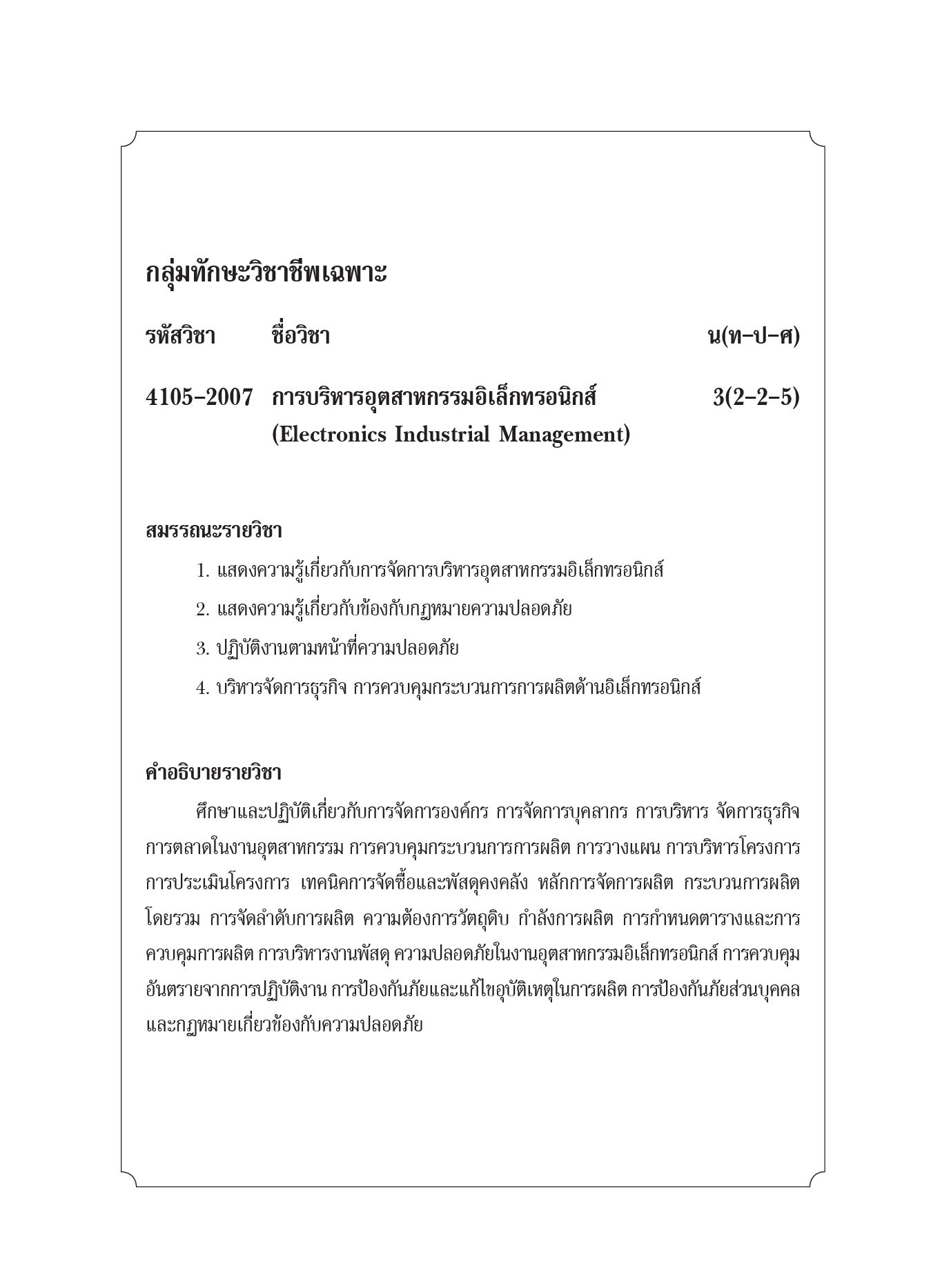 จุดประสงค์รายวิชา สมรรถนะรายวิชา และคำอธิบายรายวิชา เหมาะสำหรับนักศึกษาระดับปริญญาตรี หลักสูตรเทคโนโลยีบัณฑิต (ต่อเนื่อง) ของสำนักงานคณะกรรมการการอาชีวศึกษา กระทรวงศึกษาธิการ