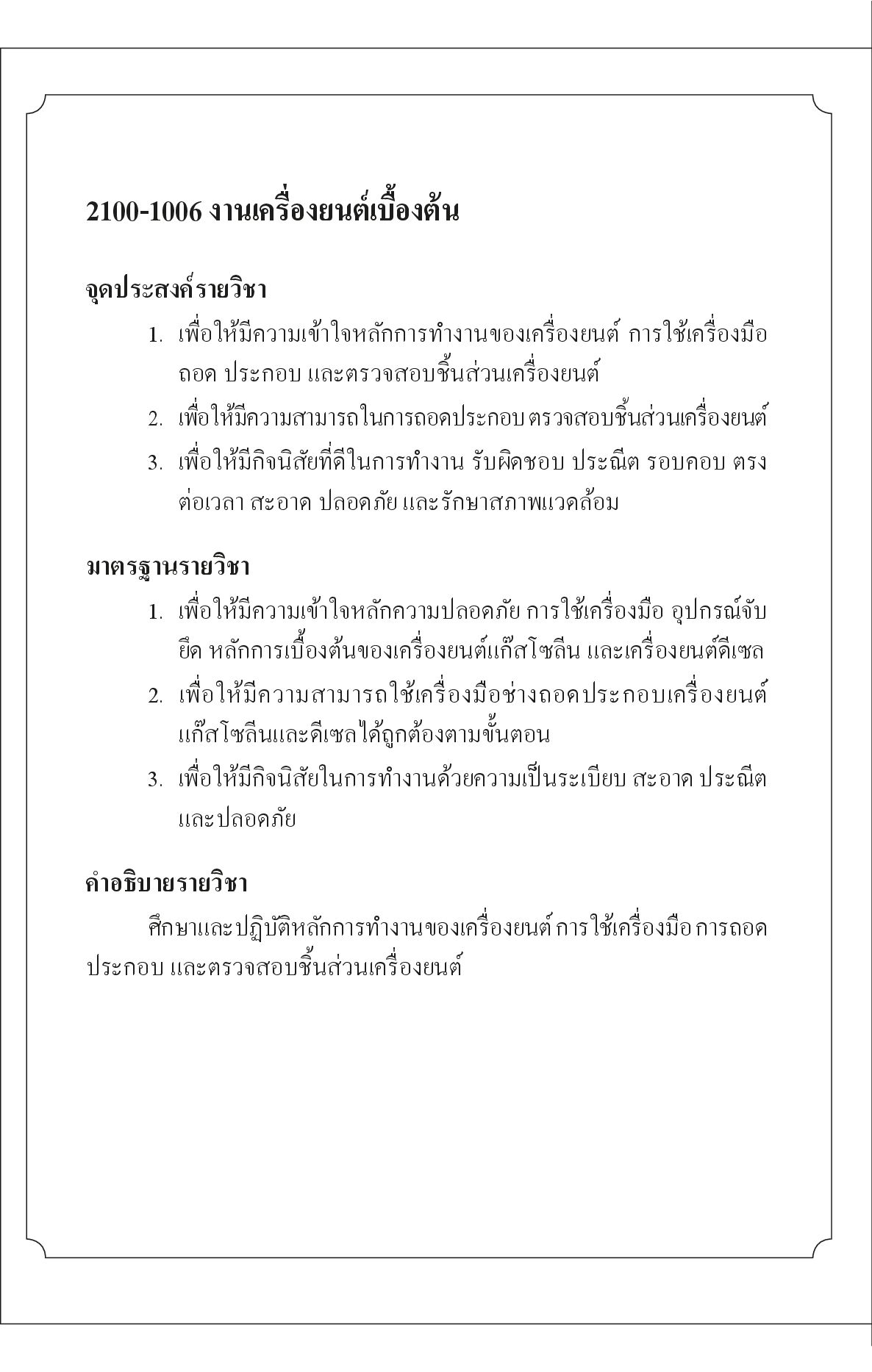 มีเนื้อหาครอบคลุมภาคทฤษฎีและปฏิบัติในการใช้เครื่องมือช่างยนต์ทั่วไป เพื่อใช้ถอด-ประกอบชิ้นส่วนต่างๆ ของเครื่องยนต์