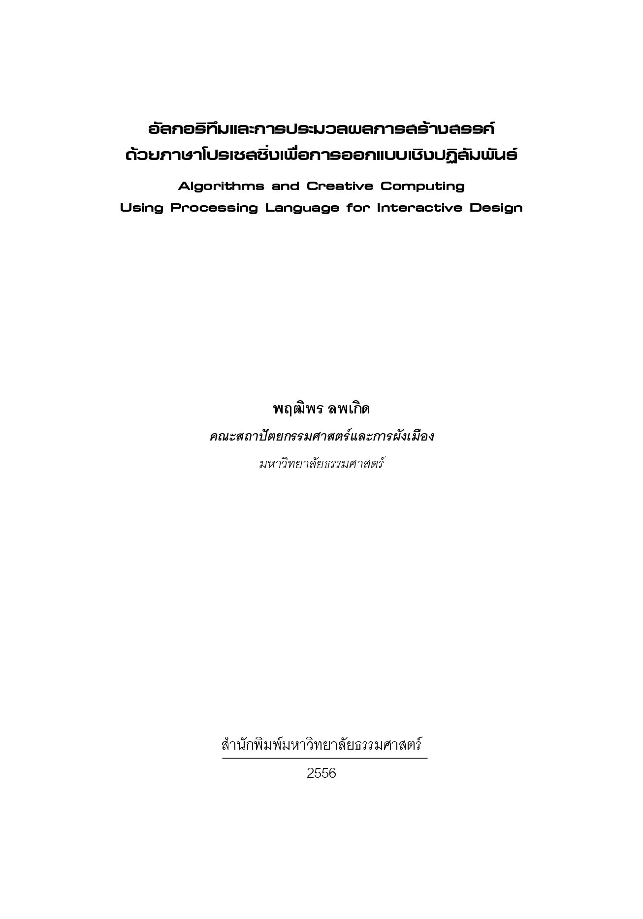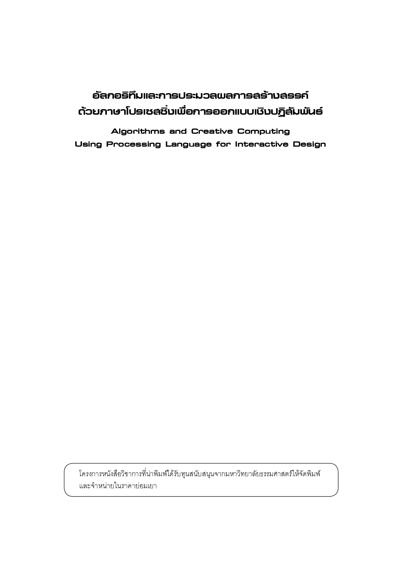 หนังสือเล่มนี้ได้รวบรวมองค์ความรู้พื้นฐานการสร้างสรรค์งานออกแบบร่วมกับขั้นตอนวิธี (algorithm) การโปรแกรมทางคอมพิวเตอร์ สำหรับการออกแบบเชิงปฏิสัมพันธ์ (interactive design) และการออกแบบเชิงจินตทัศน์ (visualizing design) ผ่านการเขียนโปรแกรมด้วยภาษาโปรเซสซิ่ง